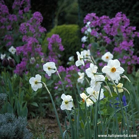 Narcissus species Actaea Recurvus is often called the pheasant’s eye or Poeticus narcissus. A stunning flower: white with a small yellow eye, edged with a deep-red margin. Excellent for naturalizing. For the real aficionado.