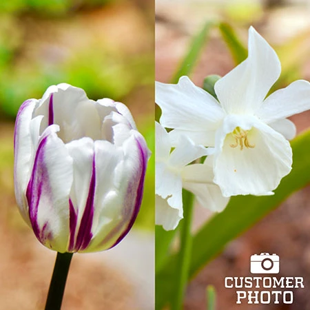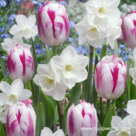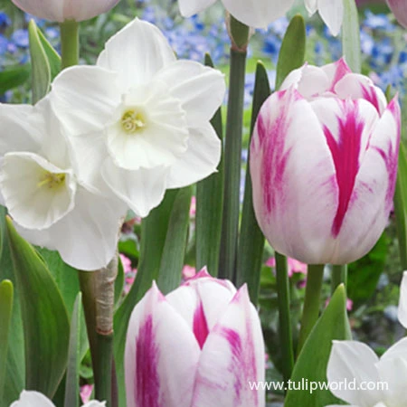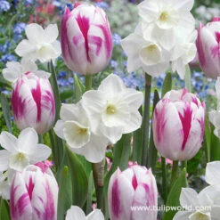 Bright and shiny mix of white daffodils and two toned pink and white tulips is a lovely addition to your Spring garden. Take the guess work out of your color combinations with this delightful combination! Would look great planted as a border or filling a whole garden bed, great for mass plantings.