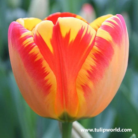 Best perennial tulip and best tulip for cutting! Up to 6″ diameter flower when open. Set your garden on fire this year with the ‘Banja Luka’ Tulip! The richly colored petals boast of a flaming yellow with red streaks and gorgeous orange underside. Symbolizes eternal happiness and perfect love! Official 11yr Wedding Anniversary flower too.