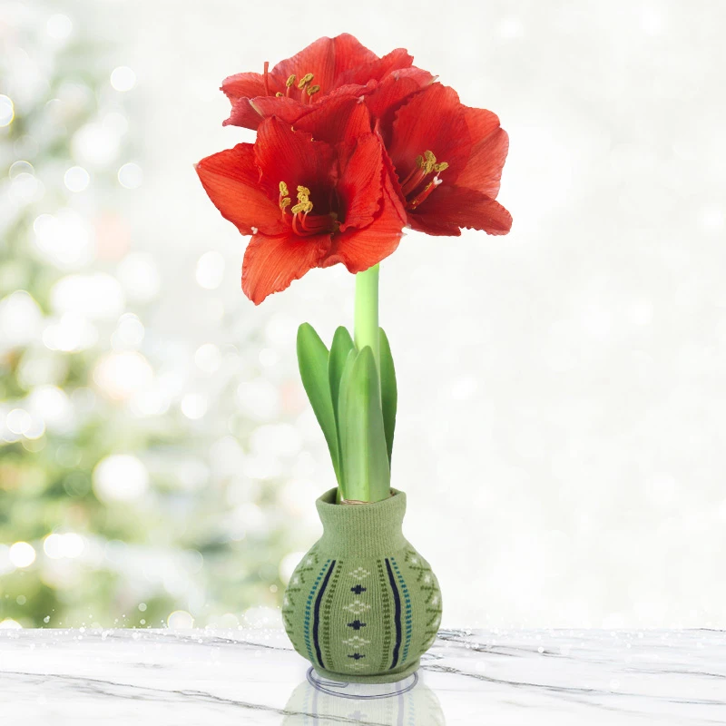 This gleaming Green Gem Sweater Amaryllis makes a delightful gift for any occasion. It includes an easy to grow amaryllis that will bloom within several weeks of receiving. Give the gift of fun, surprise and flowers all in one with the Green Gem Sweater Amaryllis.Â