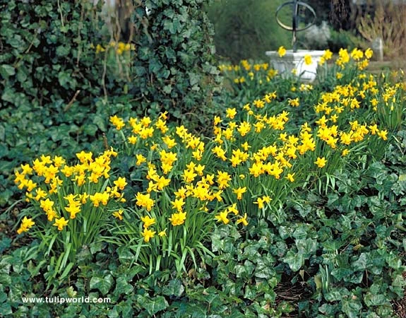 Narcissus cyclamineus belongs to the smaller types of narcissi. Elegant bulbs with slender flowers which like a rather moist soil in sun and shade. Jetfire Daffodils is one of the best American hybrids. Large golden-yellow flowers with a bright orange-red trumpet. Symbolizes new beginnings and ensures happiness.Â