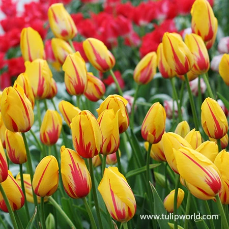 La Courtine Single Late Tulip is a graceful and tall blooming tulip that blooms at the end of the tulip season. The bright yellow blooms have red accents throughout. Large oval shaped blooms put on a display in the May garden.Â
