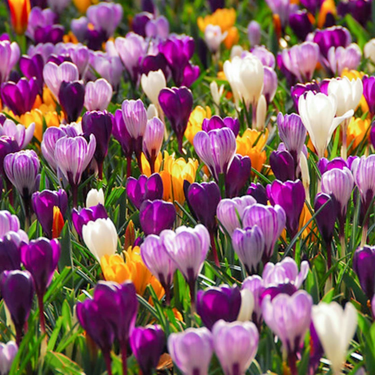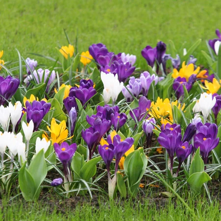 One of the first flowers to emerge in Spring these little beauties look great in rock gardens, naturalized into lawns, or in mass along a wooded edge. This Beautiful assortment of 50 mixed crocus has lovely blooms of purple, white, bi-colored and yellow. Plant in full sun, with well drained soil for best results.