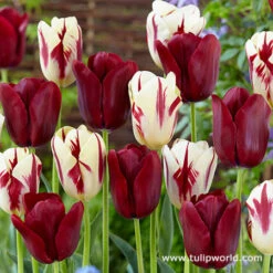 It’s a perfect match! Deep burgundy triumph tulips are paired wtih white and burgundy tulips to make a stunning and elegant spring combination. Plant 5 bulbs per square foot, this pack will cover 5 square feet.