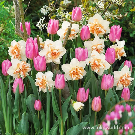 Pink tulips and daffodils mixed together in one package of 30 bulbs. Double pink daffodils bloom mid spring and are complimented by the true pink tulips that bloom at the same time.