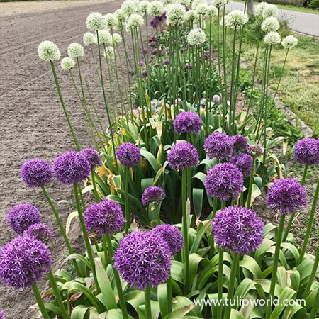 Large purple and white blooms are whimsical and wonderful. Our Purple & White Allium collection is a great way to start gardening with allium bulbs. These flowering onions add texture and shape to your garden with their large purple and white ball shaped blooms. Allium prefer to be planted in full sun in soil that drains well, and do not tolerate wet soils. Plant the purple and white allium collection in the back of the border, or mixed in with your perennial beds.